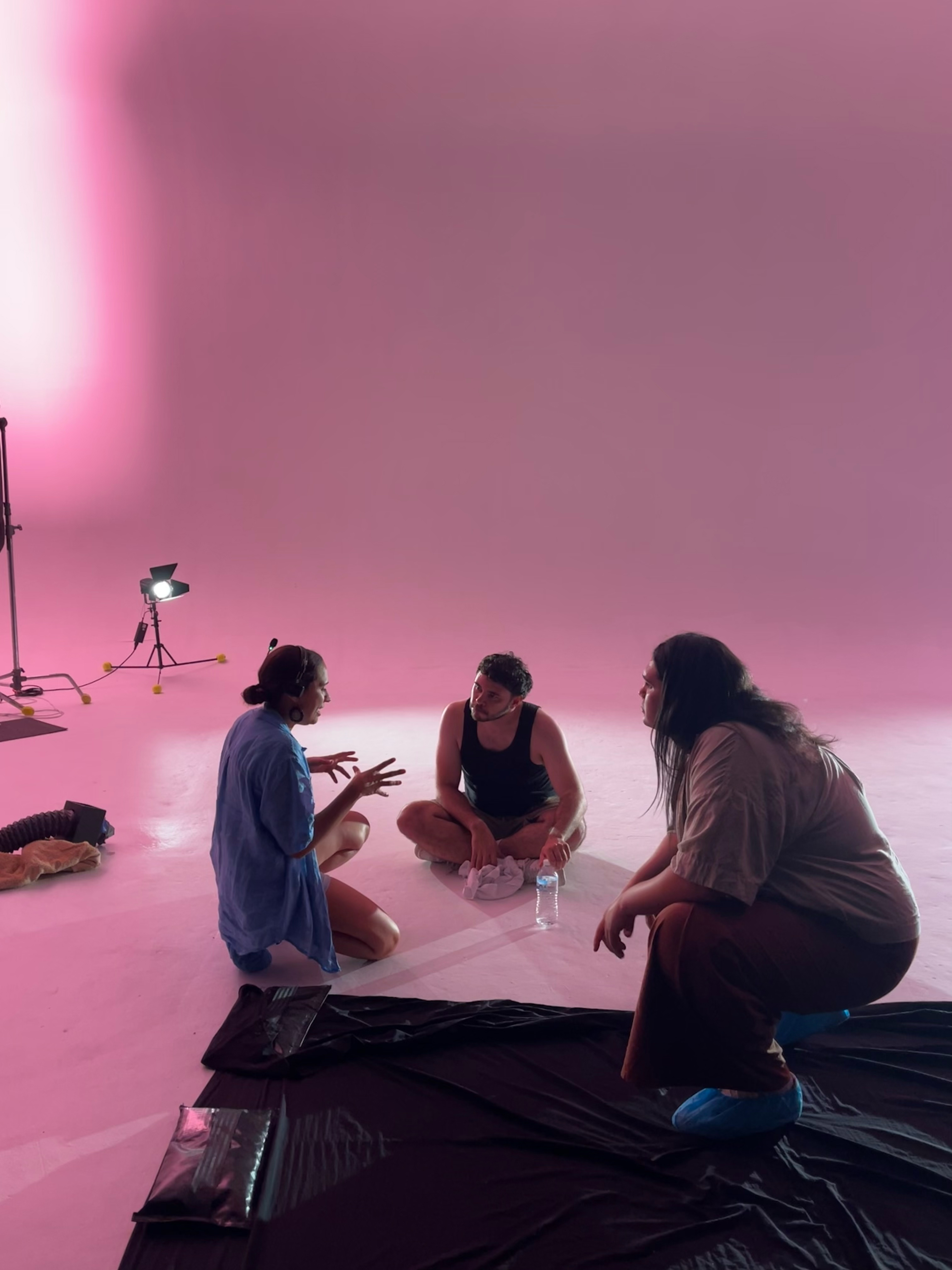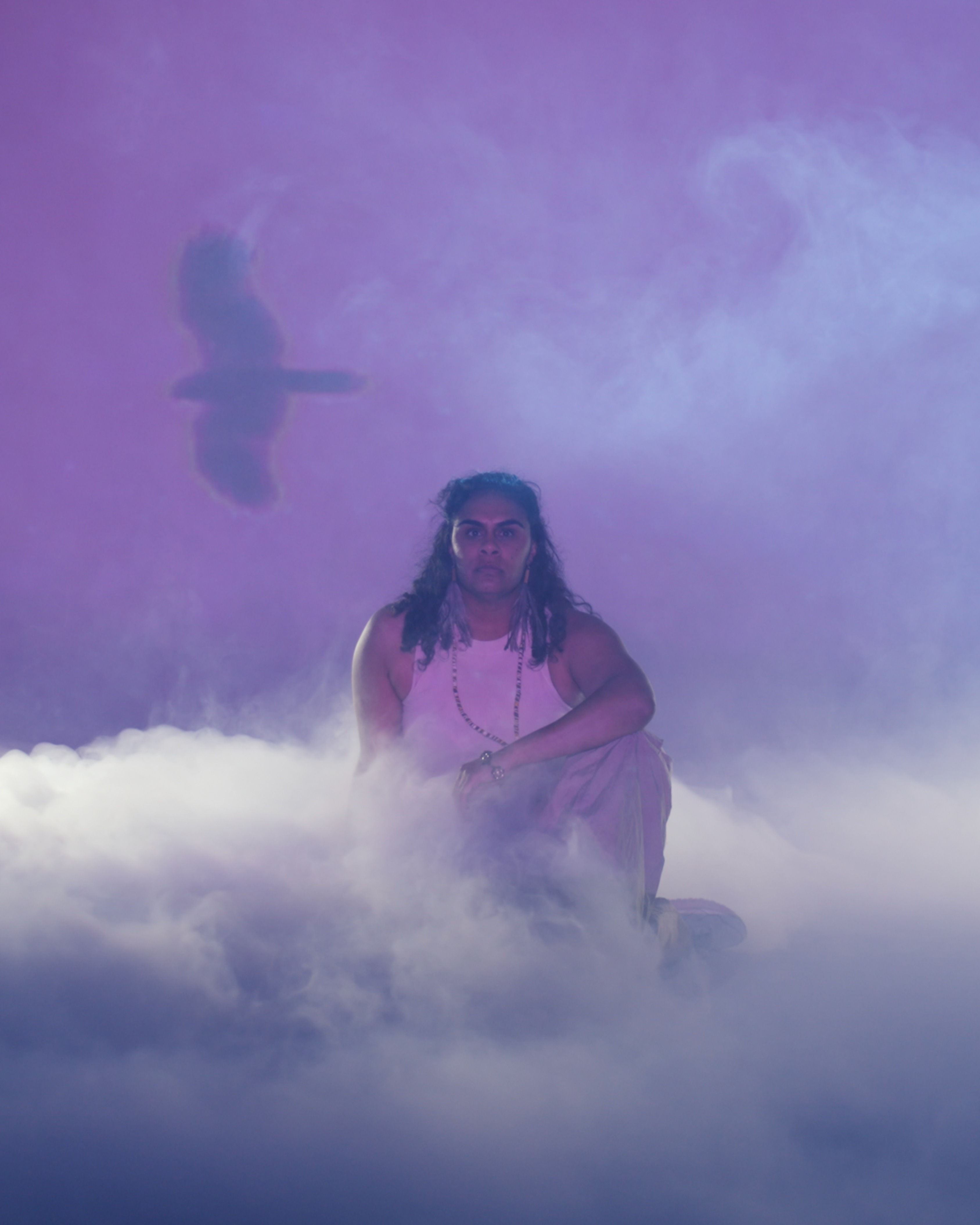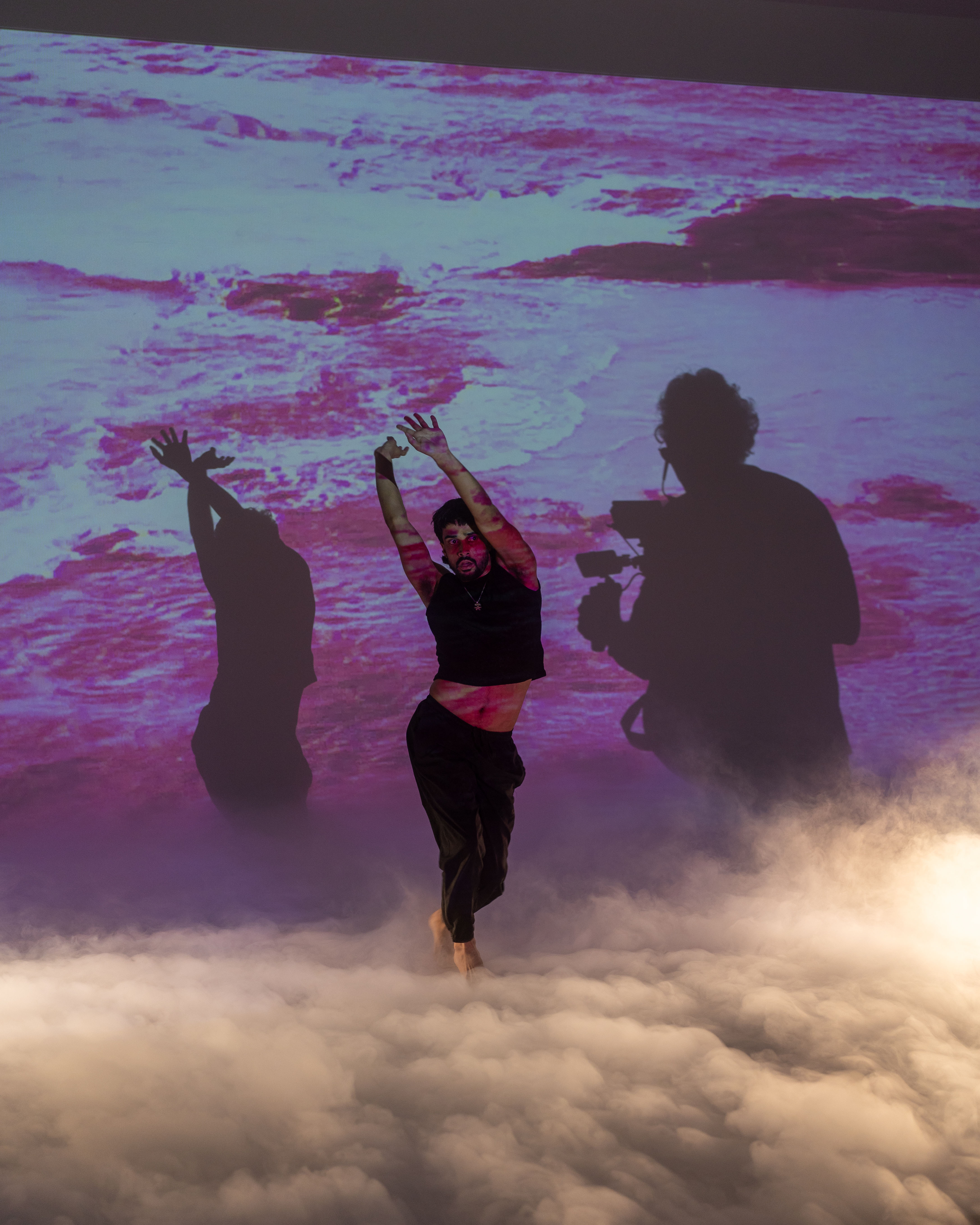 Moving into a studio for the second stage of the project, projections of Country were combined with pink lighting and white smoke, creating an atmospheric setting to film performances from queer-identifying First Nations dancers.